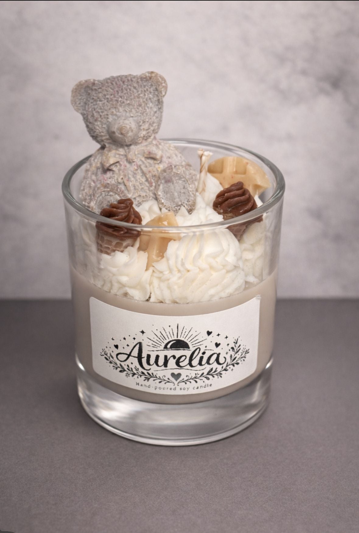 Topped with a sweet teddy and creamy whipped details, this candle fills your space with the warm, comforting scent of vanilla. Soft, nostalgic, and oh so cute. Like a dessert you never want to finish!